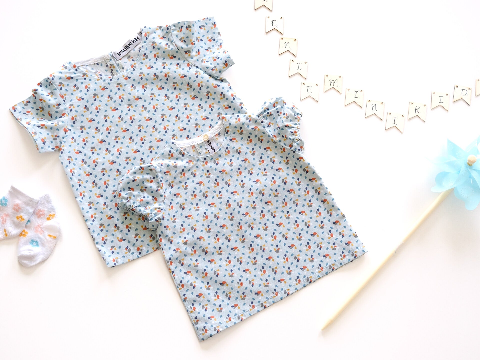 De bloesjes kan je bestellen met een aantal opties: pofmouwtje, halsruche, ...